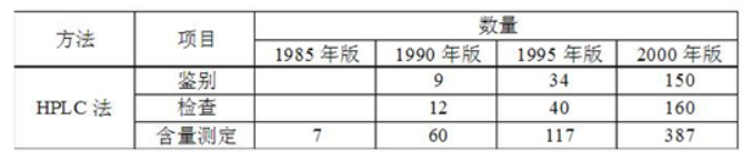 高效液相色譜是色譜法的一個重要分支。該方法已成為化學(xué)、醫(yī)學(xué)、工業(yè)、農(nóng)學(xué)、商檢和法檢等學(xué)科領(lǐng)域中重要的分離分析技術(shù)。以制藥領(lǐng)域?yàn)槔何覈幍涫蛰d高效液相色譜法項(xiàng)目和數(shù)量比較表。